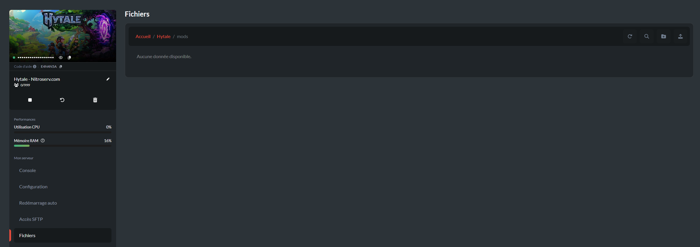 Pour installer les mods/plugins précédemment téléchargés, rendez-vous dans votre Manager puis sélectionner votre serveur Hytale.